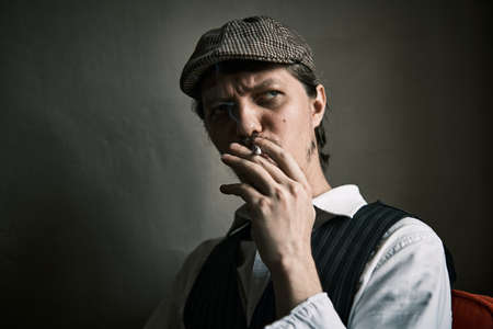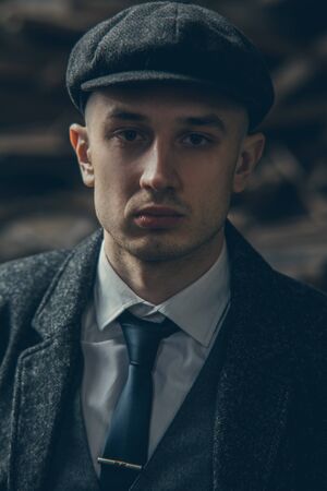 Portrait of a man in the image of an English retro gangster of the 1920s dressed in a coat, suit and flat cap in Peaky blinders style.