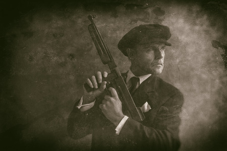 Retro 1920s english gangster wearing flat cap and suit. Standing with gun.
