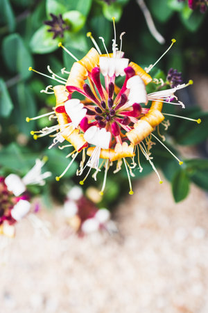 native Australian Lonicera Firecracker plant with white and magenta pink flowers outdoor in sunny backyard shot at shallow depth of field