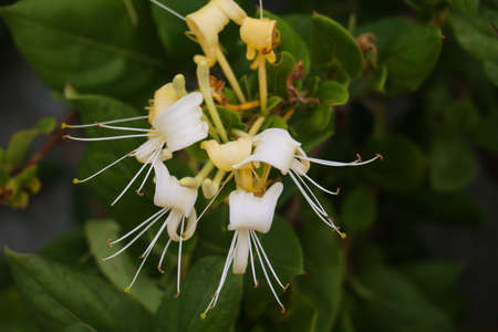 Japanese Honeysuckle blooming plant outdoors. White fragrant flowers in summer park.