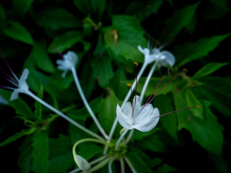 Close-up shot of Capparis sandwichiana white flower. Green leafs background
