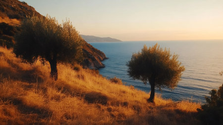 Two olive trees stand on a golden hill overlooking a tranquil ocean at sunset, creating a peaceful and scenic landscape
