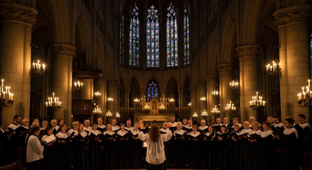 A choir performing in a grand cathedral, with stunning stained glass windows in the background, highlighting the beauty and acoustics of the space.