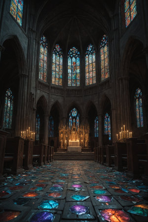 Majestic Interior of a Historic Church with Ornate Gothic Architecture and Vibrant Stained Glass Windows Creating a Serene and Spiritual Atmosphere for Worship and Devotion