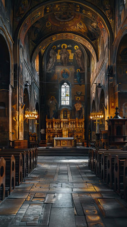 Experience the breathtaking beauty of an ancient church interior, featuring intricate artwork, a grand chandelier, and an atmosphere of spirituality and devotion.
