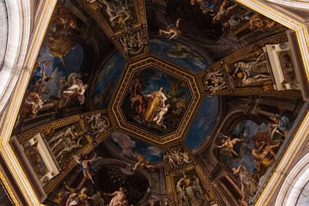 ROME, ITALY - JUNE 28, 2019: bottom view of ceiling with old frescoes in vatican