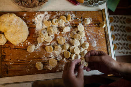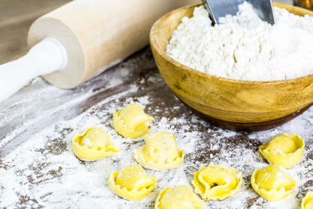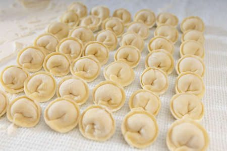 homemade meat dumplings, raw tortellini and ravioli on the table Russian cuisine
