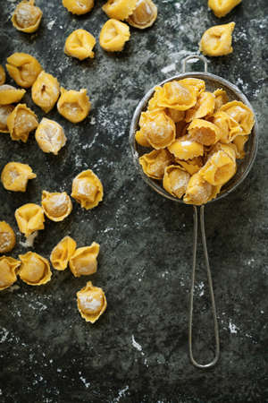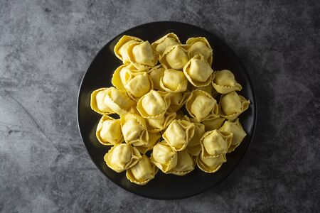 Homemade Italian traditional tortellini pasta. Dark stone background with copy space.