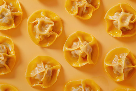 A close-up shot of golden dumplings arranged on a yellow background. The dumplings are shiny and wet, suggesting they are fresh and ready to eat.