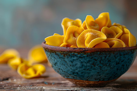 Fresh homemade tortellini in a rustic blue ceramic bowl, the rich texture and color of the pasta. this high-quality food photograph emphasizes the culinary appeal of traditional italian cuisine in a warm, rustic setting. Generative AI
