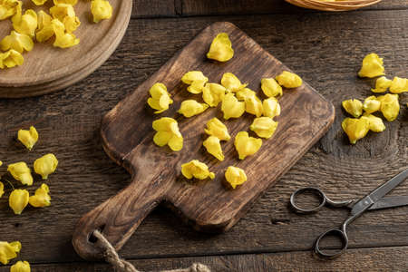 Raw italian cappelletti, fresh homemade pasta stuffed with cheese and meat on rustic wood table. Natural light.