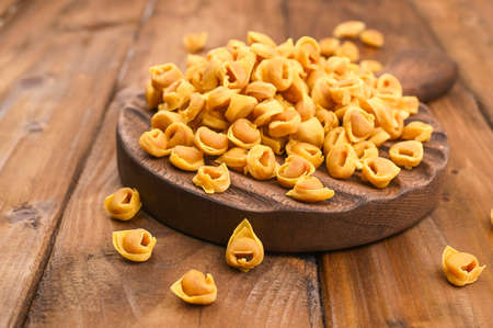 Raw Tortellini in a wooden bowl on wooden table. Traditional italian pasta.