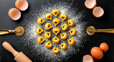 Circular arrangement of golden pasta shapes on dark surface, with flour, rolling pin, and eggshells around, highlighting the art of cooking and food preparation