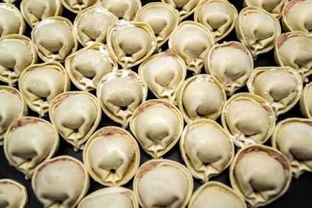 Raw tortellini. Background. Traditional Italian food concept. Horizontal orientation. Top view.