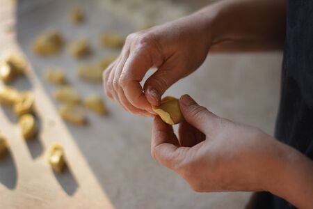 Homemade tortellini made with organic ingredients on a kitchen table.