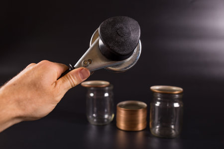 Hand holding caning key and glass jars with caps blurred on black background.