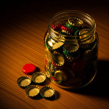 Caps from various bottles gathered in a moody dark bin, symbolizing organized recycling