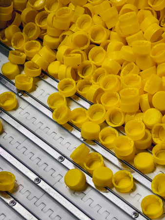 Yellow plastic caps on a conveyor belt in a factory during a production process in a manufacturing facility