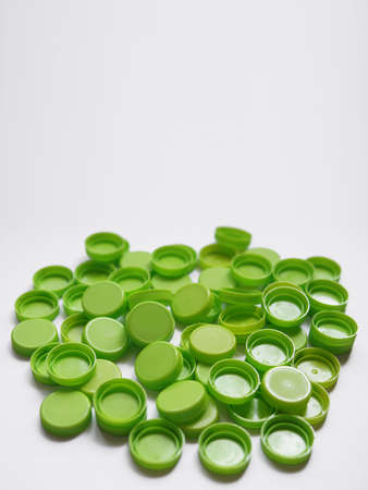 Colorful plastic bottle caps. Studio shot. Plastic waste. Isolated on a white background.