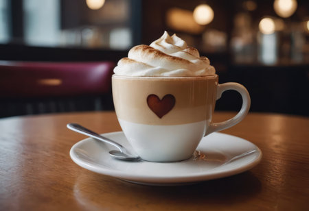 Cappuccino with heart-shaped foam art, on wooden table.