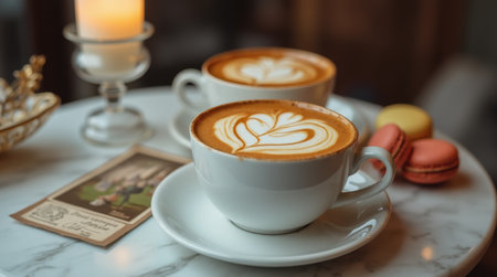 Two cups of coffee with intricate latte art rest on a marble table alongside colorful macarons and a soft candlelight, creating a cozy atmosphere perfect for relaxation.