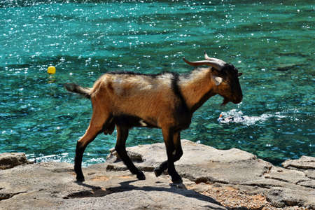 Wild tamed goat is looking and walking on the rock next to the turquoise sea water in Cala Figuera, Formentor, Mallorca, Spain