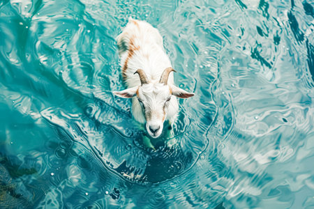 Goat is swimming in the water. The goat is white and brown. The water is blue