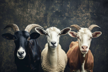 Two goats are centered in a studio-style shot with a dark backdrop. The animals display contrasting fur colors; one is black, the other white. The image exhibits a high level of detail, with visible fur texture and eye detail. It could be used for various commercial or editorial purposes.