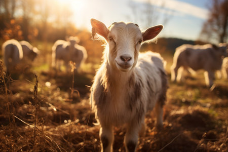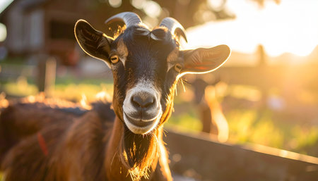A close-up of a friendly brown goat looking into the camera with a curious and gentle expression. The warm, golden light of the setting sun bathes the farm scene, creating a peaceful and idyllic atmosphere. This image captures the simple charm of rural life and animal connection.