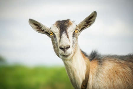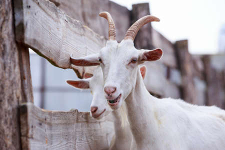 The goat on the farm looks into the frame. Selective focus. Nature.