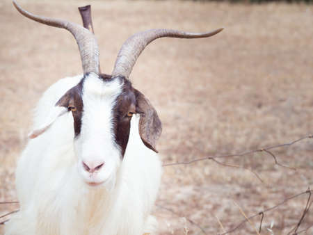 View of domestic goat, a subspecies of C. aegagrus domesticated from the wild goat of Southwest Asia and Eastern Europe. The goat is a member of the animal family Bovidae and the subfamily Caprinae
