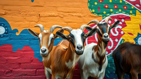 Three goats pose in front of a colorful mural in a lively urban setting during the daytime