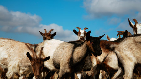 Herd of Goats Grazing in a Field Under a Blue Sky