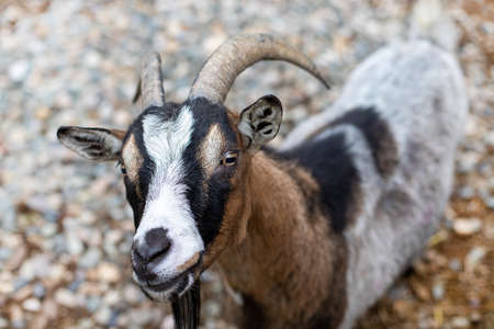One goat looks into camera begging for food. Black and white mammal. Portrait of an animal. Close up shot. Top view.