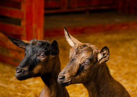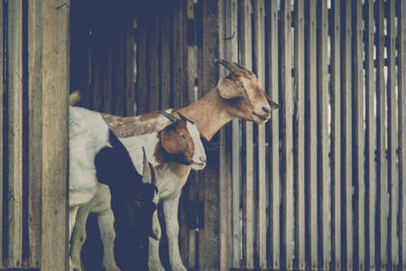 Close-up photos of goats with pensive faces at the corral of farm. Lovely couple little black and brown goats. Cute with funny.