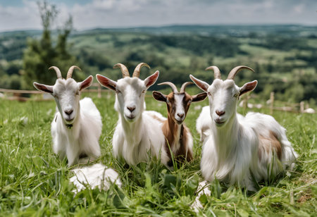 A group of seven goats stands proudly in front of a rustic wooden fence. The scenic mountain landscape and forest backdrop create a tranquil atmosphere.