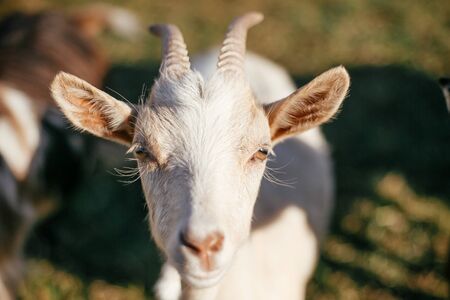 Portrait of sweet goat with horns on background of other goats grazing in countryside. Cute white goats standing in green meadow in calm sunny day on farm.