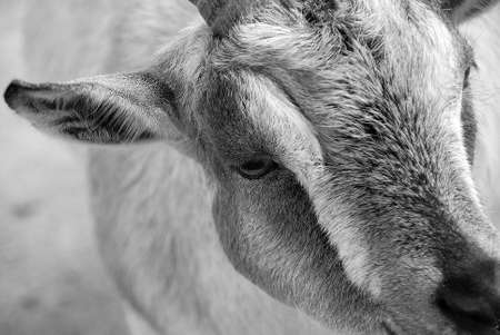 Head of a white goat in the pasture. Animal nose close up, selective focus