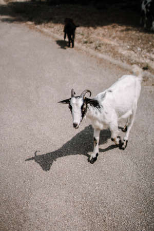 Herd of goats grazing by the road in rocky area of Peloponnese. Domestic goats of Greece, highly prized for their meat and milk production production.