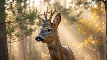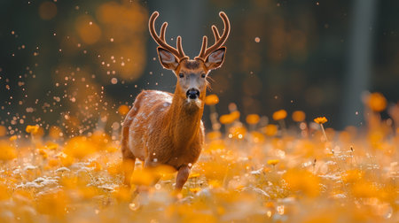 A stunning roe deer buck stands gracefully among glowing wildflowers, bathed in warm sunlight. The serene nature scene captures the essence of wildlife and natural beauty.