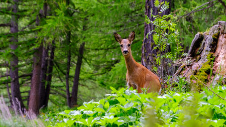 Beautiful young european roe deer, capreolus capreolus, standing in the forest and looking with curious eyes, Saas-Fee, Valais, Switzerland