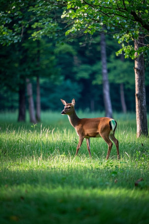 A solitary deer stands gracefully in a sunlit forest, surrounded by tall trees and lush greenery. This serene scene captures the beauty of wildlife in its natural habitat.