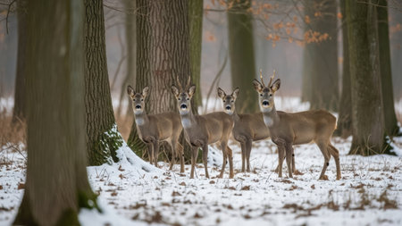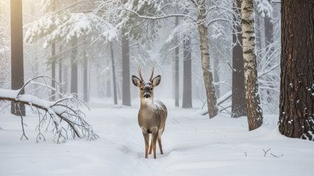 A deer stands in a snow-covered forest, surrounded by trees. The image showcases a winter scene with a serene atmosphere. The composition emphasizes the natural beauty, with a focus on cold colors and the animal. It is suitable for commercial and editorial purposes, highlighting wildlife or nature.