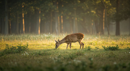 A gentle deer grazing peacefully in a serene forest meadow. Sunlight filters through the trees, casting dappled light on the deer's coat.