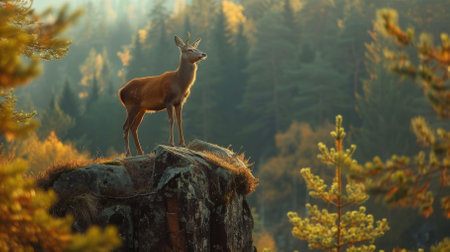 A deer stands on a rock in a forest. Concept of tranquility and natural beauty