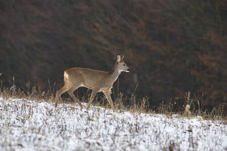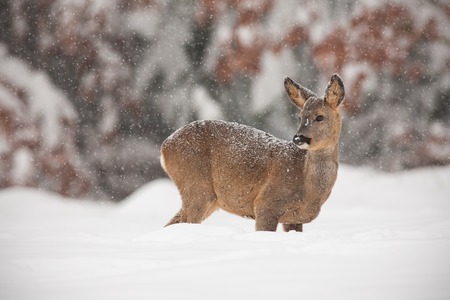 Roe deer, capreolus capreolus, in deep snow in winter. Wild animal in freezing environment. Cold wildlife scenery.