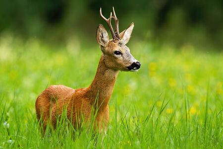 Roe deer, capreolus capreolus, buck looking away standing in tall green grass with blooming yellow wildflowers in background. Wild deer animal with antlers in fresh summer nature.