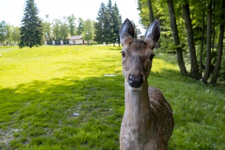 close-up of deer. Roe deer looking directly into the chamber with small horns in the forest sunlit.