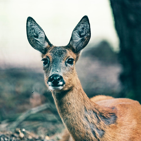 A captivating close-up image of a young deer, showcasing its curious expression and intricate details, captured in a serene forest setting.