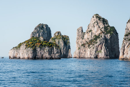 Capri, Italy - 04.29.2025: View from the sea of ​​the faraglioni limestone cliffs, in the foreground overgrown with trees and shrubs of various colors in spring.